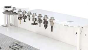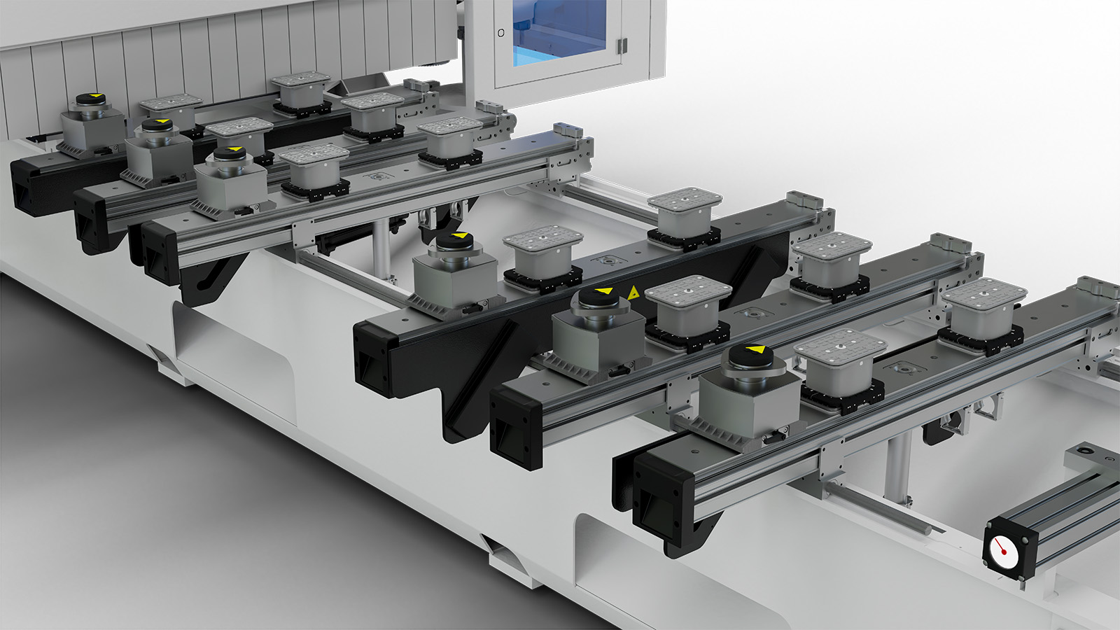 Spremenljiva hitrost obdelave in konfigurabilna opremljenost z do 31 vrtalnimi vreteni in žago za utore