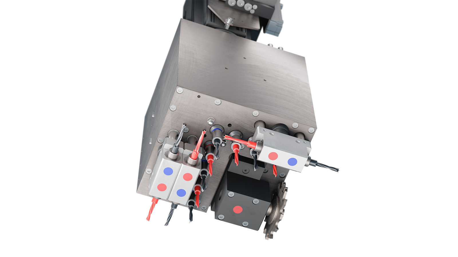 Visokohitrostna vrtalna tehnologija za natančno vrtanje. Eno od 4 možnih vrtalnih agregatov za individualno obdelavo. Vrtalni agregat V8/H6GX z 8 navpičnimi vrtalnimi vreteni, 4 vodoravnimi vrtalnimi vreteni v smeri X, 2 vodoravnima vrtalnima vretenoma v smeri Y ter z žago za utore Ø 100 mm v smeri X.